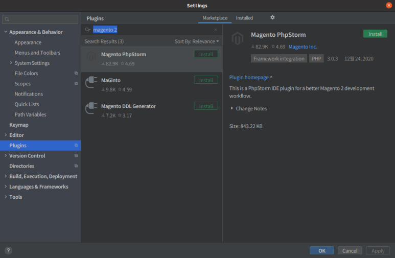 2. Plugins을 선택한 후, Type/to see options에 magento 2를 입력합니다. 결과에서 Magento PhpStorm을 선택한 후 Install을 클릭합니다.