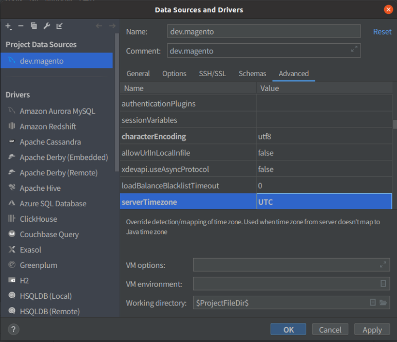 하단의 Set time zone을 클릭하고, 아래 그림처럼 serverTimezone을 UTC로 설정한 후 OK를 클릭합니다.